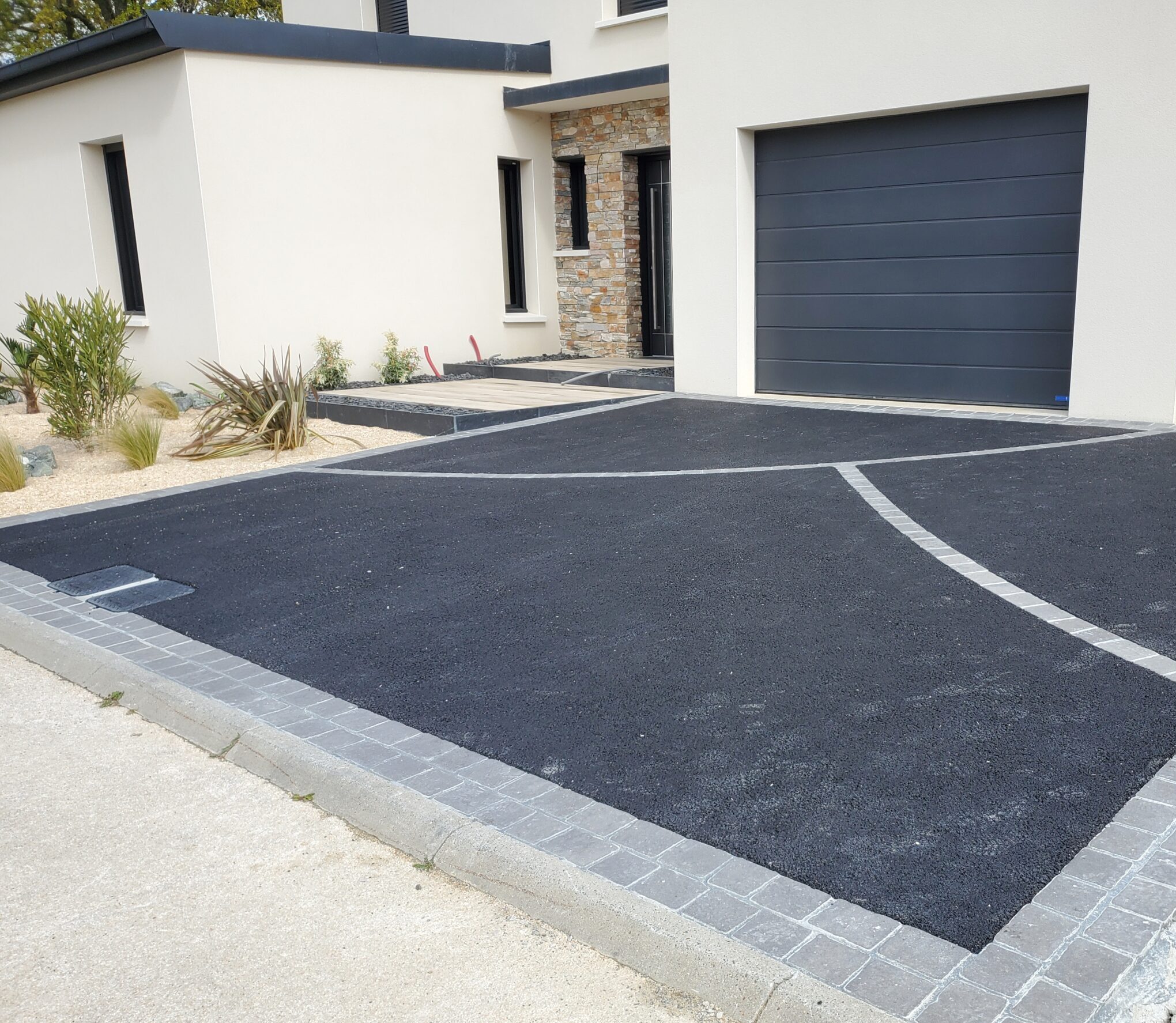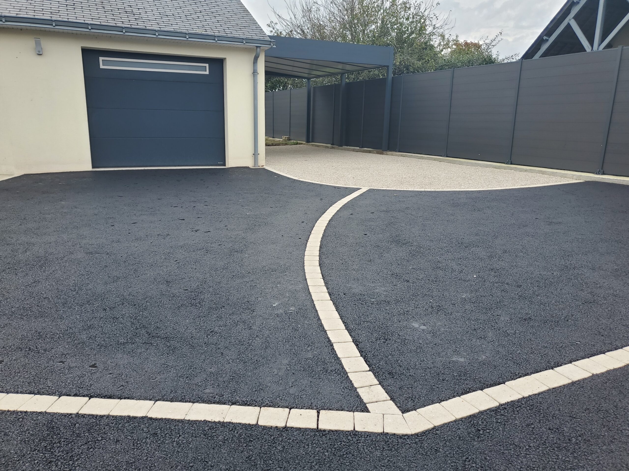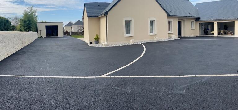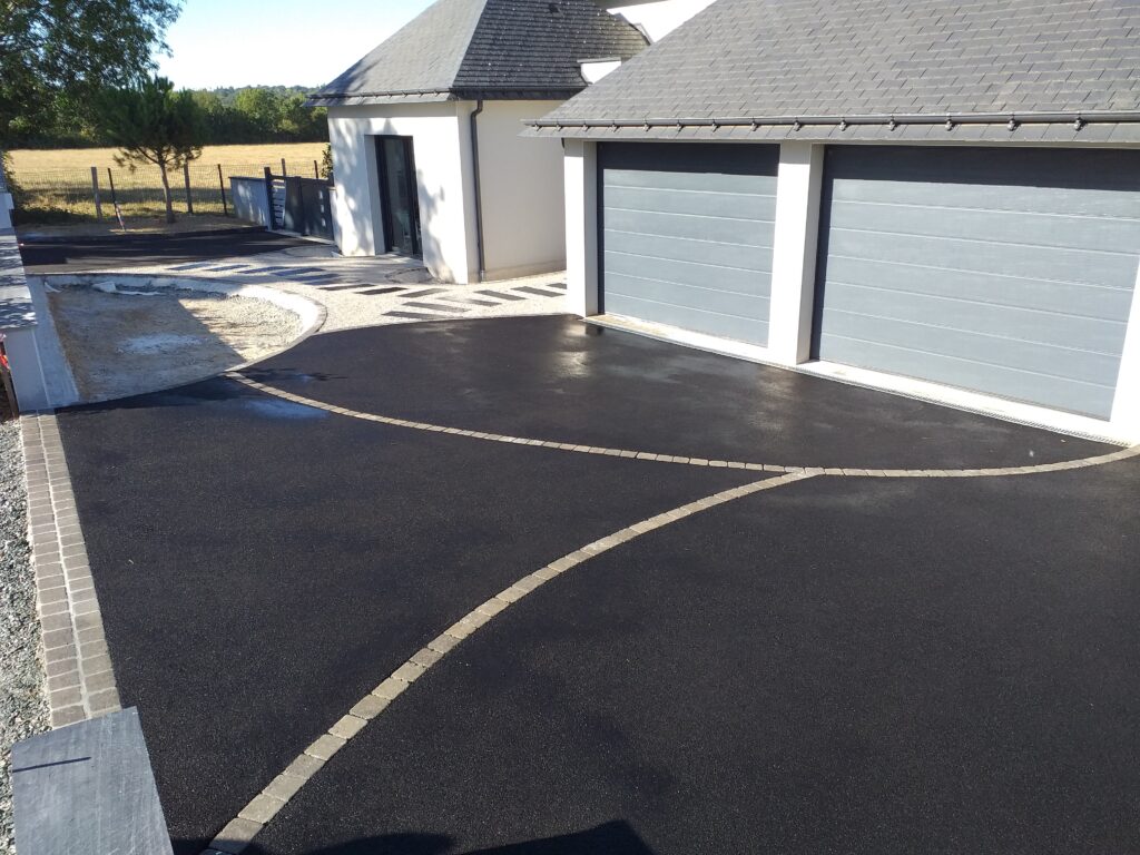Création d’une grande cour en enrobé avec un motif pavé