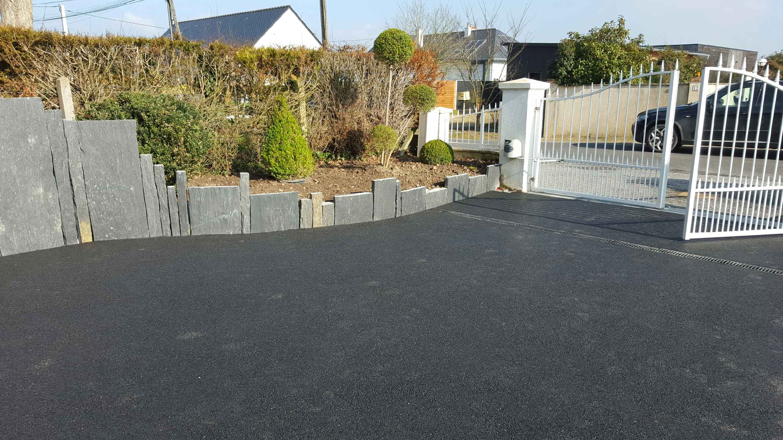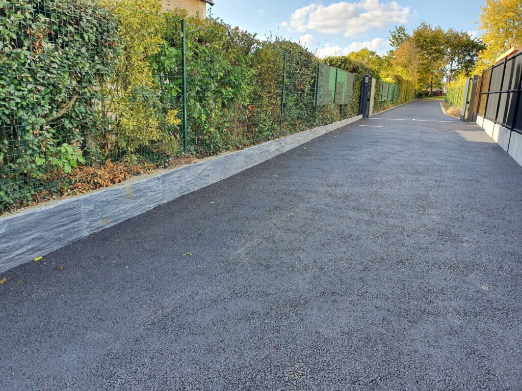 Optez pour un revêtement durable et esthétique avec notre enrobé noir à chaud, idéal pour les allées carrossables de votre propriété. Ce matériau est conçu pour résister au trafic quotidien des véhicules tout en offrant une finition lisse et uniforme.