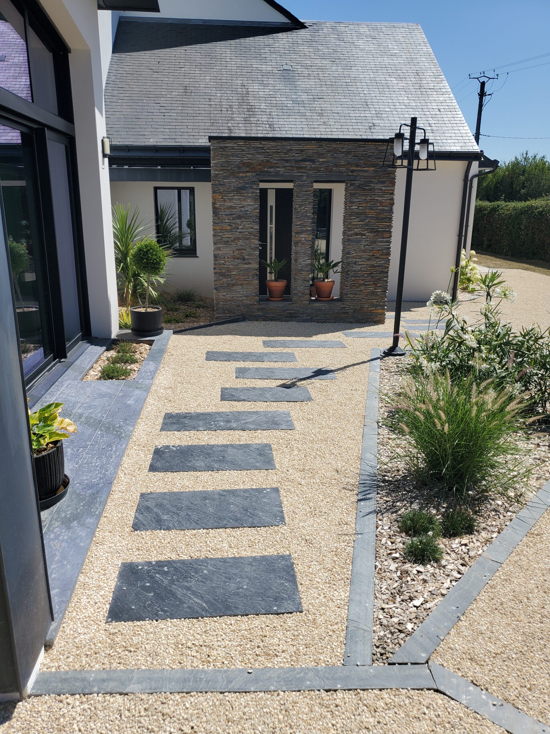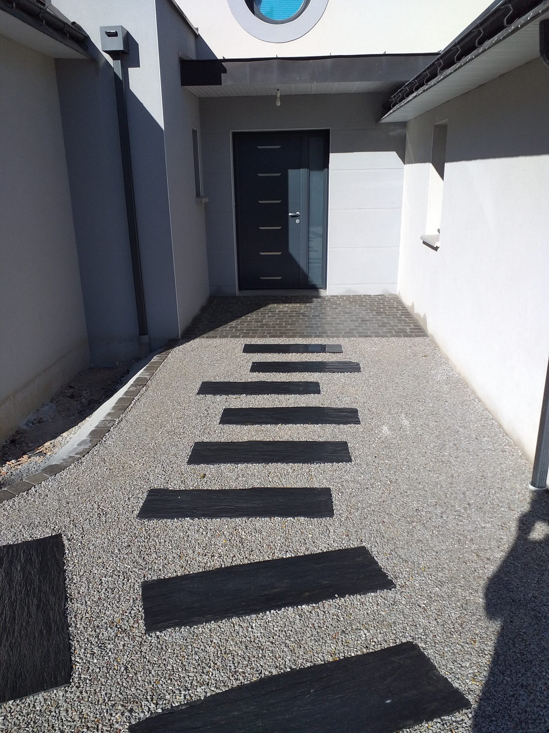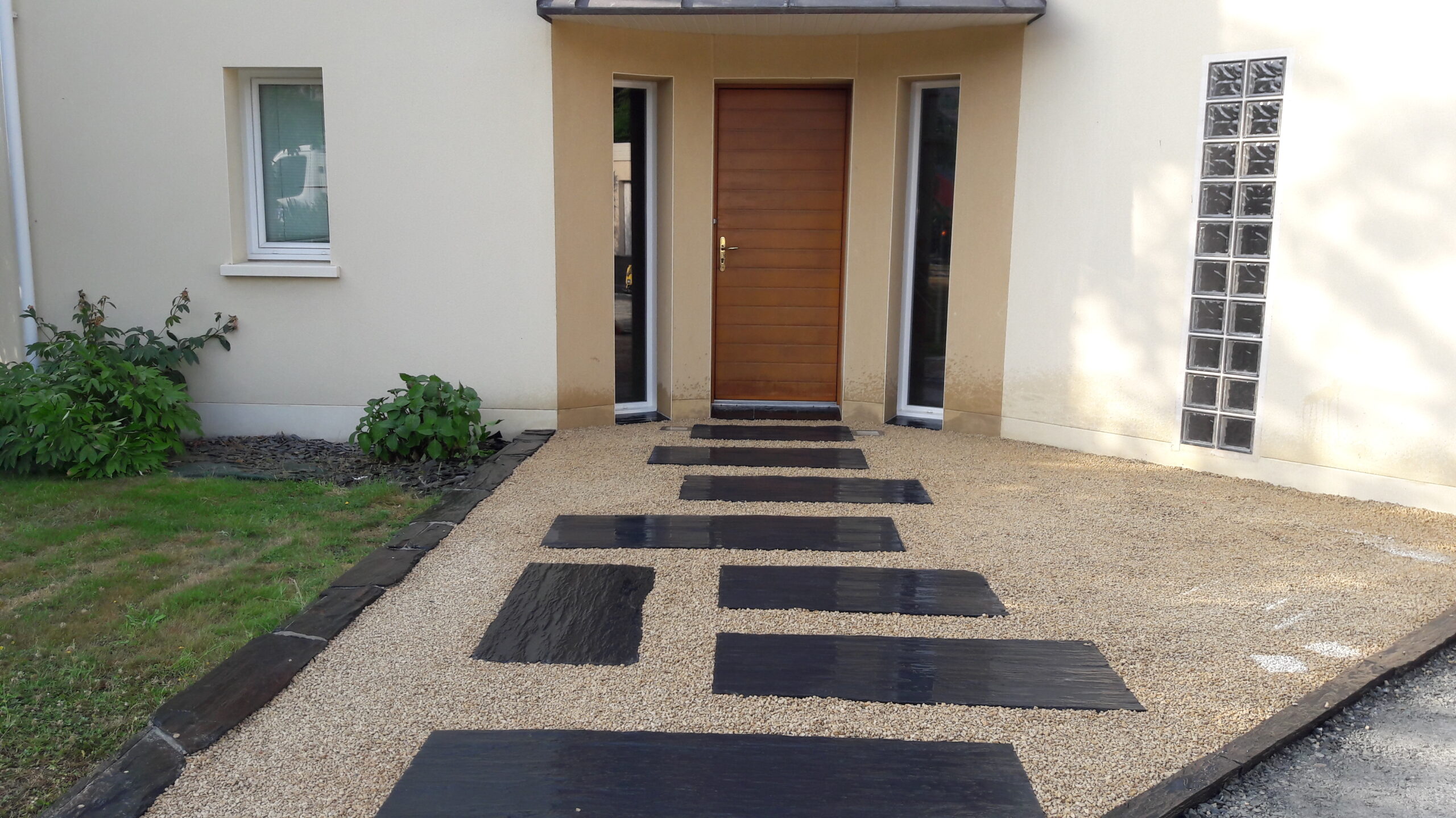 Réalisation d’une allée en dalle alvéolaire avec des pas d’ardoise
