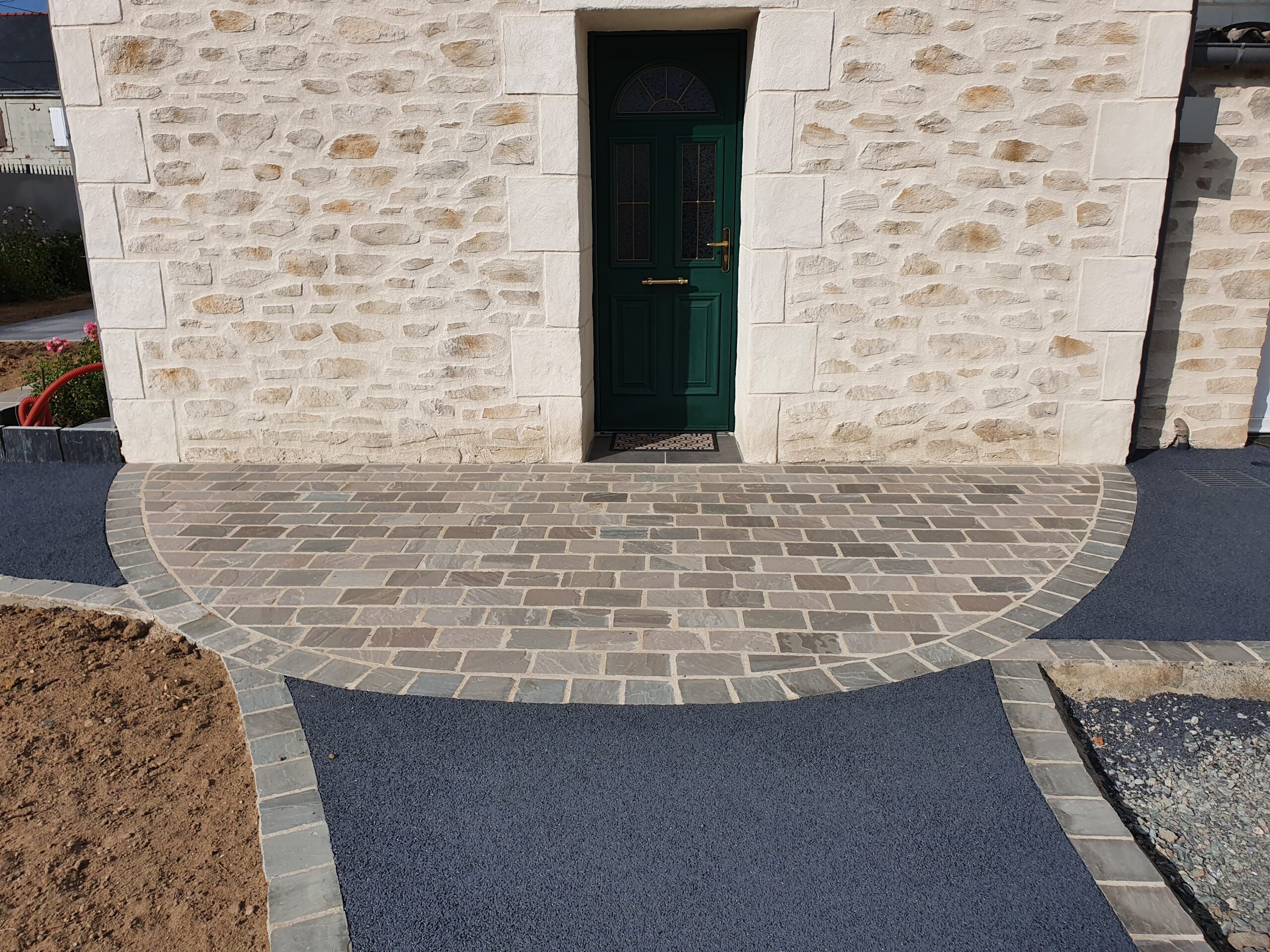 Réalisation d’un pavage en pierre naturelle devant une porte d’entrée